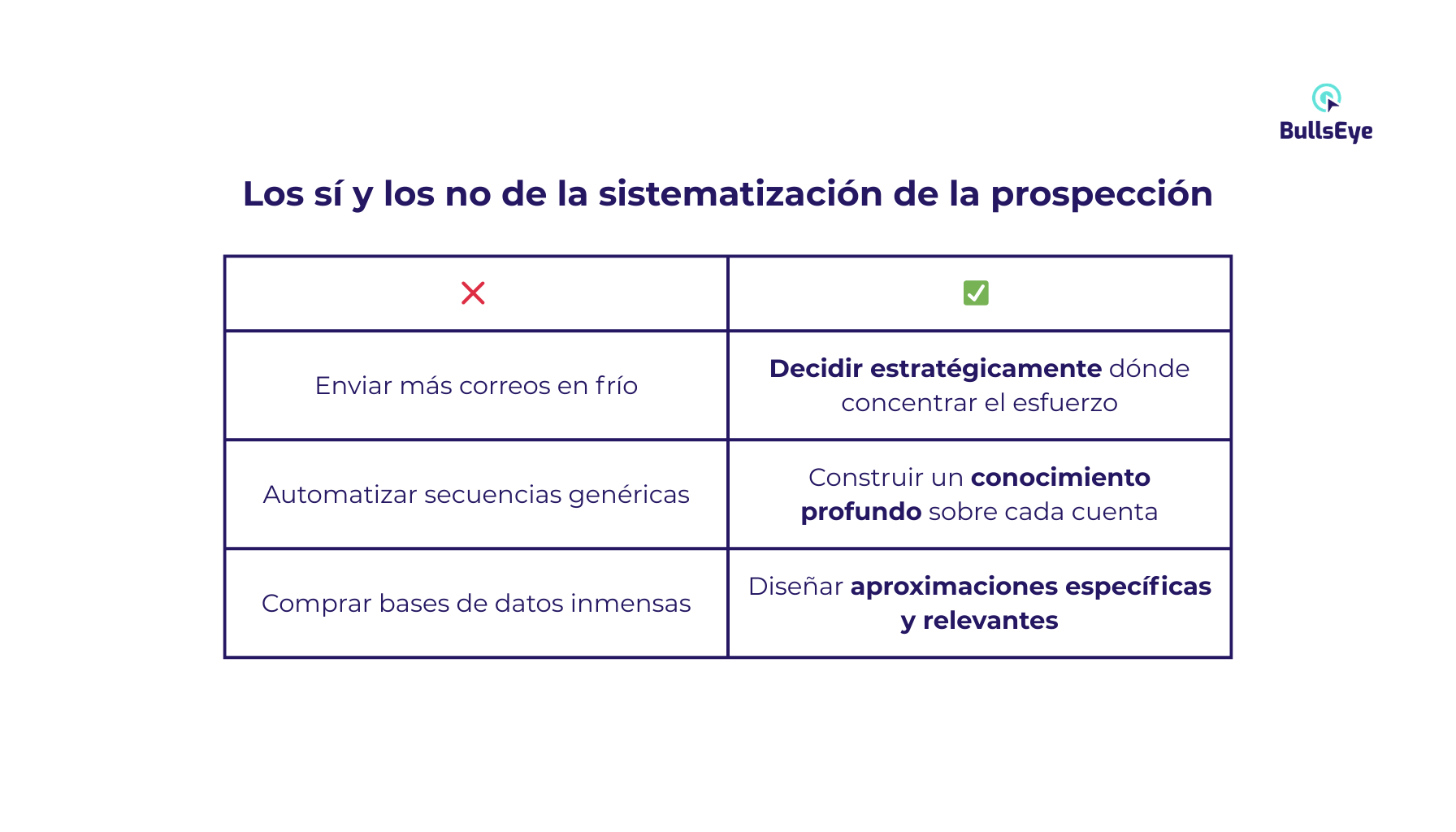 No. Aunque la tecnología ayuda, el verdadero cambio al sistematizar está en la calidad de las decisiones. Significa abandonar la lógica del «volumen descontrolado» para adoptar una de «precisión estratégica». Esto implica tener un Perfil de Cliente Ideal (ICP) estricto, priorizar cuentas basándose en señales concretas de intención, realizar investigaciones estructuradas y crear hipótesis de valor claras sobre por qué tu acercamiento es relevante para ese cliente ahora.